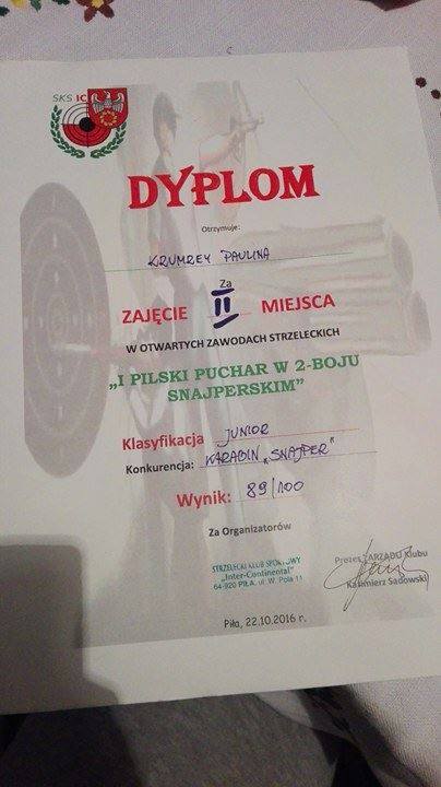 Dodatkowo miło jest nam poinformować, że reprezentantka naszego Oddziału strz. ZS Paulina KRUMREY w dniu 22 października 2016 r podczas otwartych zawodów strzeleckich „I Pilskiego Pucharu w 2-Boju Snajperskim” w klasyfikacji „junior” zajęła II miejsce.