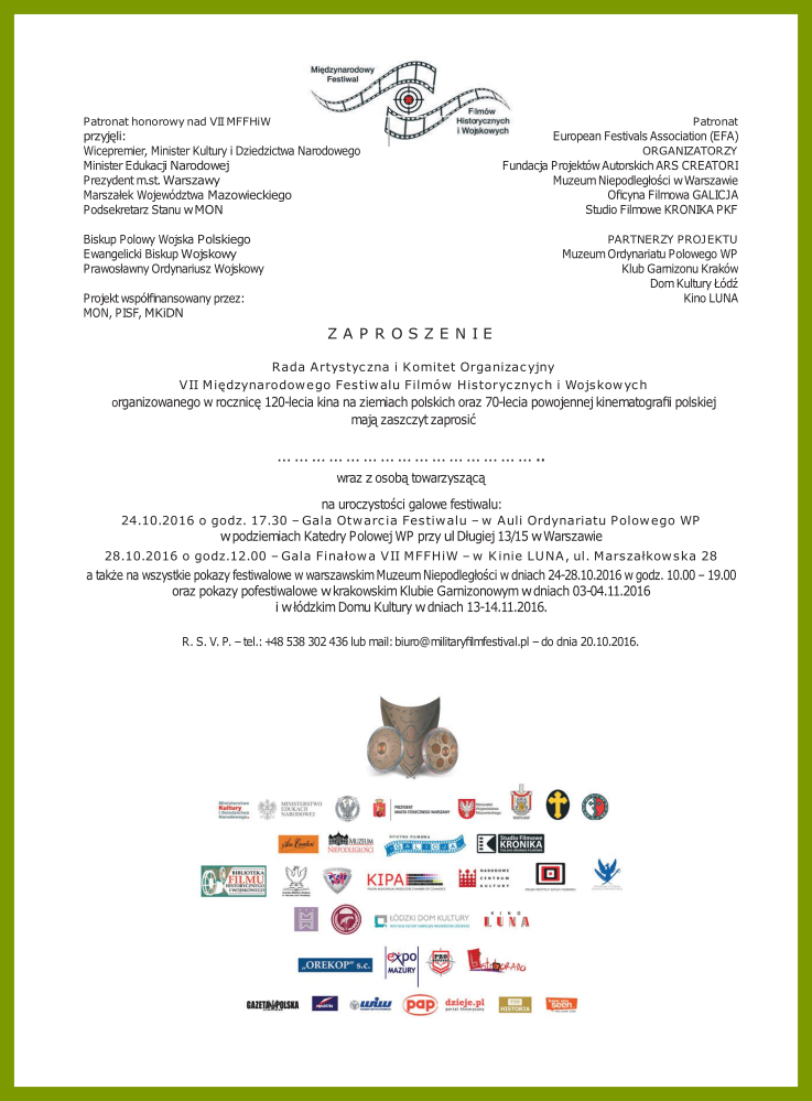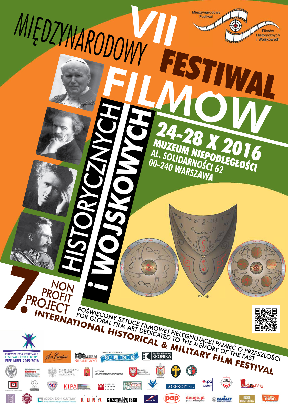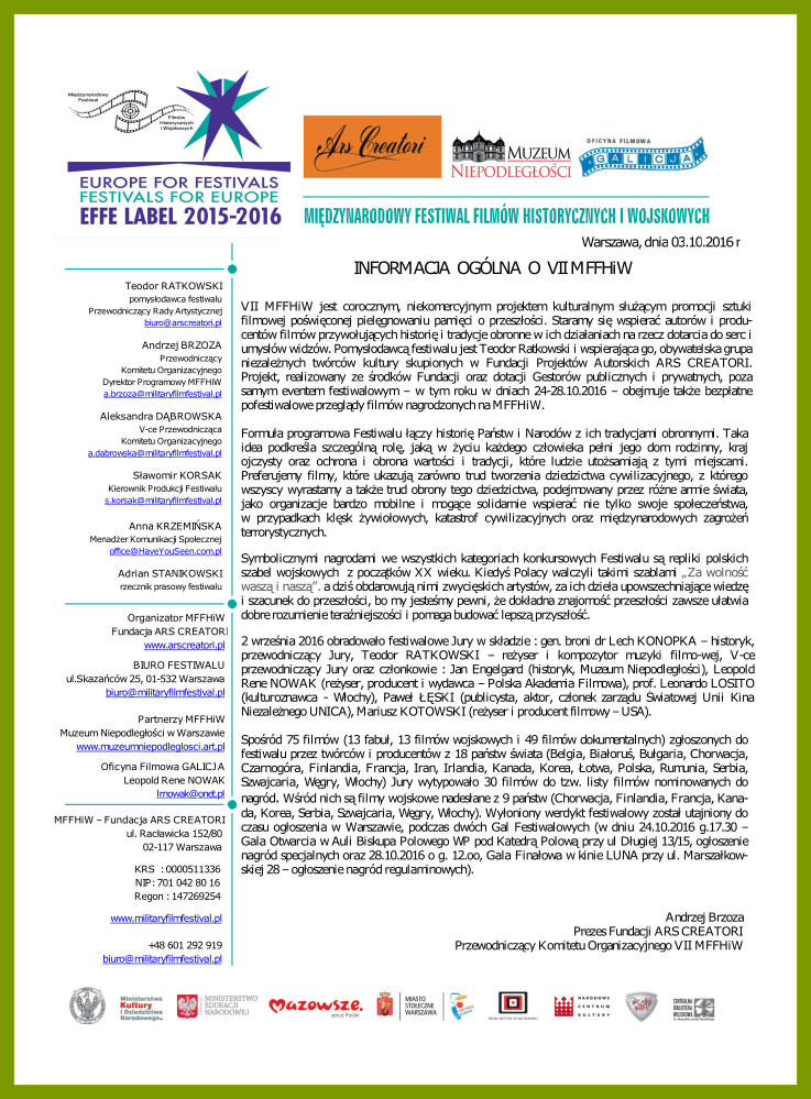 VII MFFHiW jest corocznym, niekomercyjnym projektem kulturalnym służącym promocji sztuki filmowej poświęconej pielęgnowaniu pamięci o przeszłości. Staramy się wspierać autorów i producentów filmów przywołujących historię i tradycje obronne w ich działaniach na rzecz dotarcia do serc i umysłów widzów. Pomysłodawcą festiwalu jest Teodor Ratkowski i wspierająca go, obywatelska grupa niezależnych twórców kultury skupionych w Fundacji Projektów Autorskich ARS CREATORI. Projekt, realizowany ze środków Fundacji oraz dotacji Gestorów publicznych i prywatnych, poza samym eventem festiwalowym – w tym roku w dniach 24-28.10.2016 – obejmuje także bezpłatne pofestiwalowe przeglądy filmów nagrodzonych na MFFHiW.