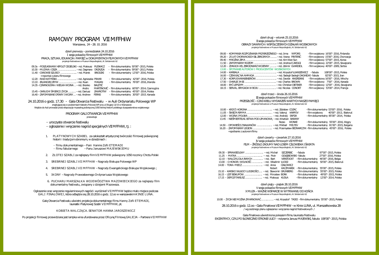 Spośród 75 filmów (13 fabuł, 13 filmów wojskowych i 49 filmów dokumentalnych) zgłoszonych do festiwalu przez twórców i producentów z 18 państw świata (Belgia, Białoruś, Bułgaria, Chorwacja, Czarnogóra, Finlandia, Francja, Iran, Irlandia, Kanada, Korea, Łotwa, Polska, Rumunia, Serbia, Szwajcaria, Węgry, Włochy) Jury wytypowało 30 filmów do tzw. listy filmów nominowanych do nagród. Wśród nich są filmy wojskowe nadesłane z 9 państw (Chorwacja, Finlandia, Francja, Kana-da, Korea, Serbia, Szwajcaria, Węgry, Włochy). Wyłoniony werdykt festiwalowy został utajniony do czasu ogłoszenia w Warszawie, podczas dwóch Gal Festiwalowych (w dniu 24.10.2016 g.17.30 – Gala Otwarcia w Auli Biskupa Polowego WP pod Katedrą Polową przy ul Długiej 13/15, ogłoszenie nagród specjalnych oraz 28.10.2016 o g. 12.oo, Gala Finałowa w kinie LUNA przy ul. Marszałkowskiej 28 – ogłoszenie nagród regulaminowych).